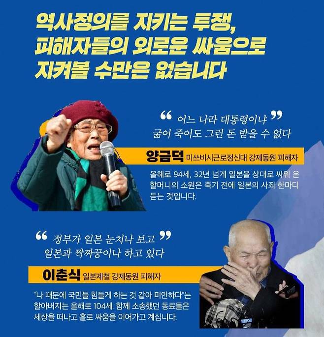 | ▲ 정부의 '제3자 변제안'을 거부한 일제 강제동원 피해 원고 4인을 응원하는 ‘역사정의를 위한 시민모금’ 홍보물. |