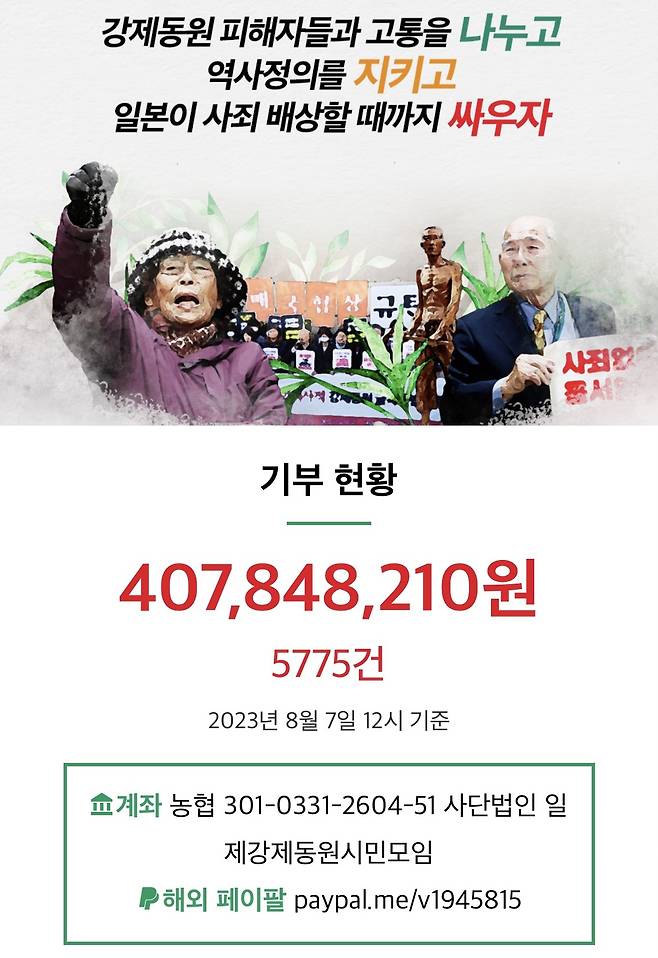 '역사정의를 위한 시민모금'을 주관한 사단법인 일제강제동원시민모임은 7일 정오 현재 모금건수는 5775건, 누적 모금액은 4억 784만 8000원이라고 밝혔다.