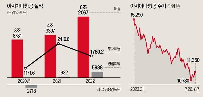 산은이 2020년 11월 대한항공과 아시아나항공의 통합을 처음 발표한 뒤 3년여의 시간이 흐르는 동안 아시아나항공은 망가지고 있다. 지난 1분기 기준 아시아나항공의 총부채는 12조8147억원으로 부채비율은 2000%를 넘어섰다. 2020년 1월 이후 신규 채용도 못했다. 아시아나항공이 흔들리는 사이 대한항공은 사실상 독점적 사업자로 자리를 굳혔다.