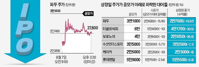 올해 첫 기업공개(IPO) 대어인 파두의 상장 첫날 주가가 공모가 아래로 떨어졌다. 지난해 상장한 보로노이와 더블유씨피에 이어 대어들이 잇따라 증시 데뷔전에서 고전하는 모습이다. 증권가에선 하반기 예정된 공모기업의 가격 거품이 걷힐지 여부를 주목하고 있다.