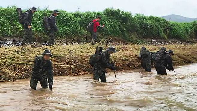 급류가 무릎 이상 높이로 흐르고 있는데 구명조끼도 입지 않은 장병들이 하천을 뒤지고 있습니다.