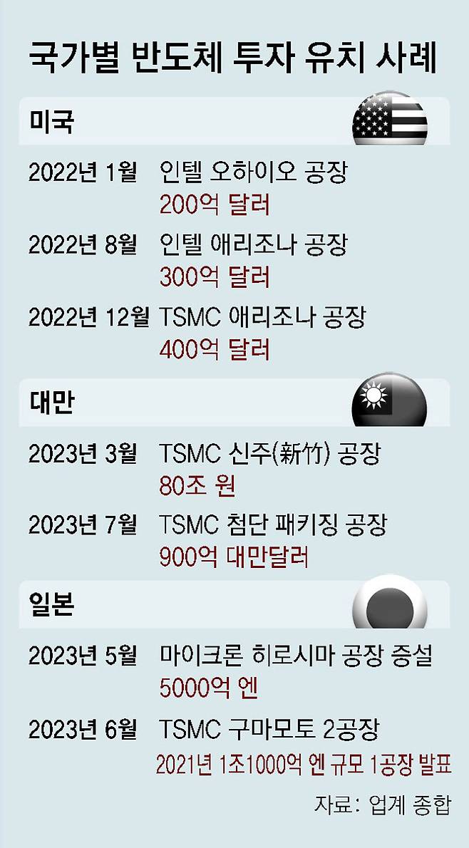 미국은 527억 달러(약 68조7000억 원)를 들여 반도체 산업을 지원하는 ‘칩스법’을 앞세워 투자 유치를 본격화하고 있다. 미국 인텔은 오하이오와 애리조나에 총 500억 달러 규모로 공장을 짓고 있고, 마이크론은 뉴욕에 최대 1000억 달러를 투입해 대규모 공장을 짓기로 했다. 삼성전자와 TSMC도 각각 텍사스와 애리조나에 170억 달러, 400억 달러 규모로 파운드리 시설을 확충하고 있다.