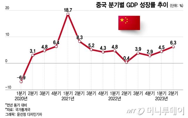 중국의 2분기 경제 성장률은 전년 동기 대비 6.3%를 기록했지만, 1분기에 비해서는 0.8% 성장에 그친 것으로 나타났다. 중국 정부는 올해 성장률 목표치로 5% 안팎이라는 보수적인 수치를 제시했으나, 상반기에 5.5% 성장률을 기록한 데다 여러 월간 지표가 부진해 아슬아슬한 상황이다. 중국의 생산자물가지수(PPI)는 지난해 10월 이후 8개월 연속 하락했으며 지난 6월 소비자물가지수는 전년 동월과 같은 수준을 유지하며 2년래 최저치를 기록했다.