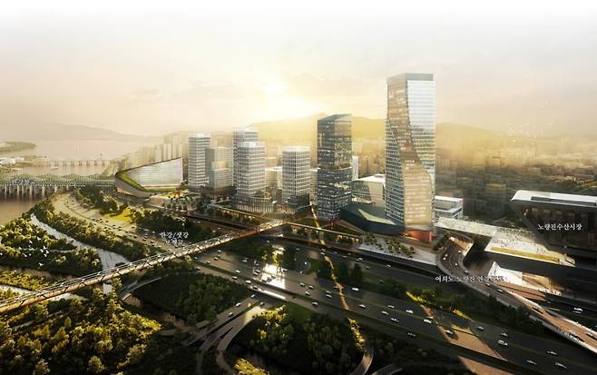 야구장과 축구장이 있는 곳은 예전 노량진 수산시장이 있던 곳입니다. 기존 수산시장이 현대화 계획에 따라 현재 자리로 옮기고 난 후 기존 건물을 철거한 자리입니다. 최근 서울시가 가결한 '한강철교 남단 저 이용 부지 일대 지구단위계획 지정 및 계획 결정안'에 따르면 이곳은 여의도, 영등포 도심과 연계한 업무, 주거 기능으로 고밀 개발을 유도할 방침이라고 합니다. 서울시의 구상대로 개발이 진행되면 노량진역에서 한강공원까지 걸어서 8분 이내에 갈 수 있는 도로가 놓이게 됩니다. 한강 조망이 가능한 공동 주택과, 여의도에서 이어지는 업무 단지 시설뿐 아니라 호텔, 컨벤션, 문화시설을 포함한 복합 상업 시설로의 개발도 검토가 진행 중입니다.