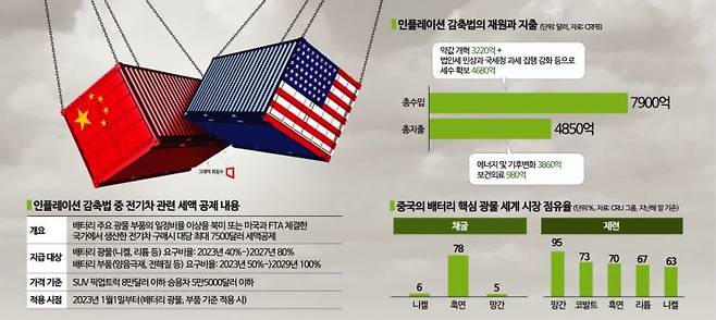 IRA는 전기차 분야에서 북미 내 생산·조립 확대를 유도하는 한편 배터리에서 중국산 광물 의존도를 낮추는 것을 목표로 한다. 배터리의 핵심 광물과 부품의 일정 수준 이상을 북미나 미국과 자유무역협정(FTA)을 맺은 나라에서 가져와야 보조금을 지급한다. 중국 등 우려 국가에서 추출·제조된 광물을 사용하면 보조금 지급 대상에서 제외된다. 표면적으로는 법안명과 같이 인플레이션에서 주요 부분을 차지하는 에너지 자립과 기후변화 대처를 내세웠지만, 사실상 과녁은 중국에 두고 있다. 급부상하는 중국의 전기차와 배터리 시장을 누르는 한편 미국의 제조업을 부흥시키면서 반도체에 이어 배터리 산업 패권 경쟁에서도 확실한 우위를 점하겠다는 계산이다.