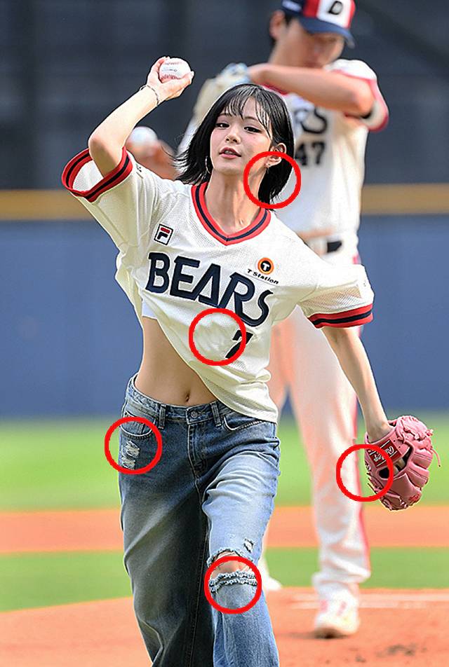 이채영은 이날 와이드 핏의 청바지에 상의는 오버사이즈 두산 유니폼을 매치해 스타일리시한 시구 패션을 완성했습니다.