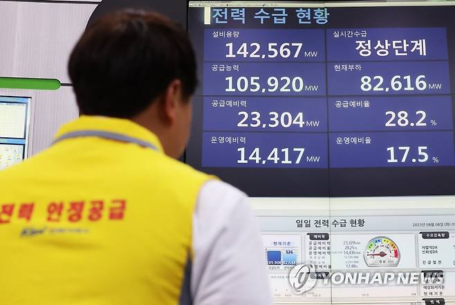 (의왕=연합뉴스) 홍기원 기자 = 8일 오전 경기도 의왕시 전력거래소 경인지사에서 관계자가 전력수급상황을 주시하고 있다. 2023.8.8