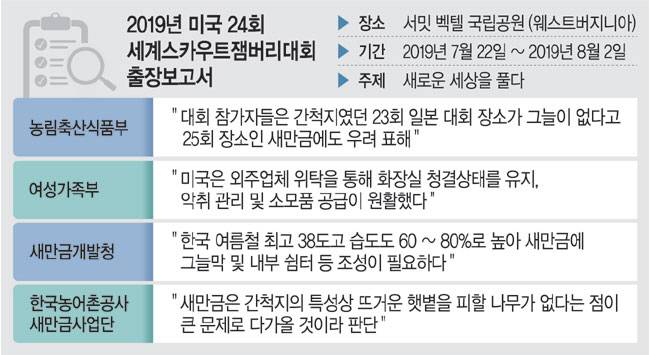 문화일보가 8일 '국외출장연수정보시스템'에서 정부 기관들이 2019년 7∼8월 미국에서 열린 '제24회 잼버리'를 다녀온 출장 보고서를 분석한 결과, 보고서 내용 중에는 4년 뒤 새만금 잼버리 사태를 예방할 수 있는 제언들이 수차례 등장하는 것으로 파악됐다.
