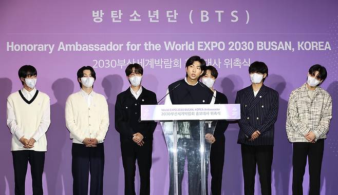 | ▲ 그룹 방탄소년단(BTS)이 2022년 7월 19일 서울 용산구 ㈜하이브에서 열린 2030 부산엑스포 홍보대사 위촉식에서 홍보대사로 위촉된 후 소감을 말하고 있다. |