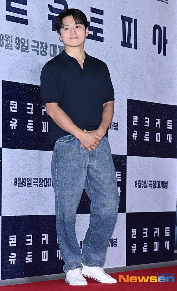 배우 조복래가 8월 8일 오후 서울 송파구 롯데시네마 월드타워에서 열린 영화 '콘크리트 유토피아' VIP 시사회 포토월에서 포즈를 취하고 있다.