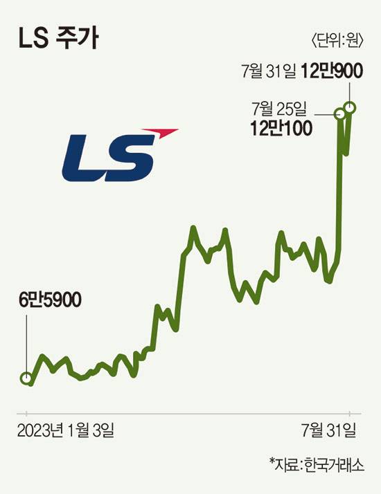LS네트웍스 주가는 지난 7월 25일 이후 뚜렷한 상승세를 펼치고 있다. 29일 종가는 6500원으로 24일 주가(2730원) 대비 2.4배 뛰었다. 8월 들어서도 등락을 거듭했지만 오름세를 이어가는 중이다. LS그룹 지주사 ㈜LS(이하 LS) 주가도 7월 25일 가격 제한폭(29.98%)까지 오른 12만100원에 장을 마쳤다. LS일렉트릭, LS전선아시아 등 다른 계열사 주가도 일제히 상승 랠리에 동참하는 분위기다. 지난 7월 한 달간 LS와 LS일렉트릭 주가는 각각 30.14%, 33.29% 뛰었다.