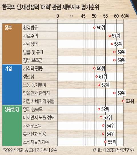 8일 국민일보 취재를 종합하면 IMD는 한국에 대해 ‘소비자물가지수’를 63개국 중 55위, ‘노동 동기부여’를 52위, ‘미세먼지 노출’을 53위로 분류했다. ‘정의 실현’은 42위, ‘해외 고급인력 유입’은 49위에 머물렀다. 이 지표들은 세계인재경쟁력보고서의 ‘매력도’ 산출에 직접적으로 반영되는 11가지 지표 중 일부다. 외국 인재가 바라보는 한국은 ‘정착하고 싶은 나라’로 꼽히긴 어려울 것이라는 의미로 풀이된다.