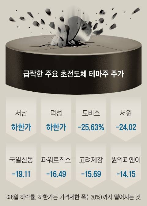 테마주 열풍에 편승해 개인 투자자들이 몰리며 과열됐던 상온 초전도체 관련주들이 8일 미국발(發) 부정 평가에 일제히 폭락했다.