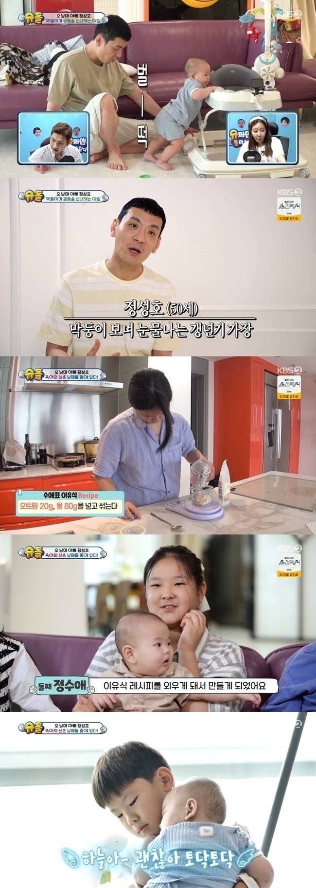 수애는 "엄마가 이유식 만드는 걸 옆에서 보다 보니까 레시피를 외워서 만들게 됐다"고 털어놨다. 하늘이가 뜨거울까 봐 온도까지 체크한 수애. 누나의 정성을 알기라도 하듯 하늘이는 맛있게 이유식을 받아먹었다. 이에 정성호는 "너 진짜 타고났다"고 말해 웃음을 안겼다.