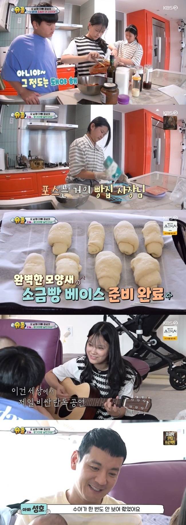 한편 수아는 독학으로 익힌 기타를 연주하며 '폰서트'를 불렀다. 정성호는 "수아가 한 번도 안 보여줬다. 생일 선물로 기타를 사줬는데 학원을 안 다니겠다고 하더라. 근데 코드가 손에 다 잡힌다"며 흐뭇함을 드러냈다.