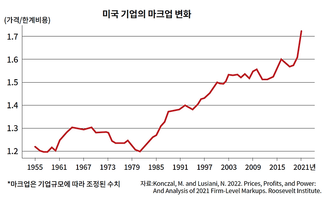 이는 인플레이션과 함께 기업의 이윤 마진 혹은 ‘마크업’(가격/한계비용)이 크게 높아졌고 국민소득에서 기업의 이윤이 차지하는 몫도 커졌음을 의미한다. 실제로 여러 연구자들은 1990년대 이후 미국에서 여러 산업의 집중과 독점이 심화되어 기업의 마크업이 높아졌다고 보고한 바 있다. 루스벨트 연구소의 실증연구에 따르면, 2021년 미국 기업들의 마크업이 치솟았는데, 이는 당시 인플레이션 급등의 중요한 배경으로 보인다(편집자 주: 기업은 상품 원가를 의미하는 한계비용에 마진을 붙여 가격을 결정한다. 원가가 100원인데 마진이 10원이라면 가격은 110원이다. 마크업은 ‘가격/한계비용’이므로 1.1이다. 마진이 20원이면 가격은 120원, 마크업은 1.2가 된다. 마크업은 기업 측이 원가 대비 얼마나 많은 수익을 취하는가를 가리키는 개념이다).