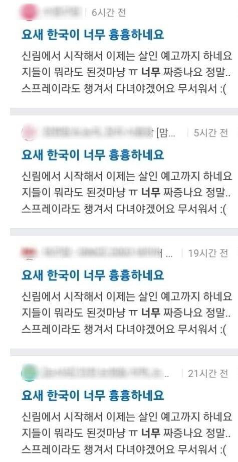 글쓴이는 "신림동에서 시작해서 이제는 살인 예고까지 한다. 자신들이 뭐라도 된 것처럼 너무 짜증 난다"라면서 "무서워서 스프레이라도 챙겨 다녀야겠다"는 똑같은 내용의 글을 수십군데 맘카페에 게재했다.