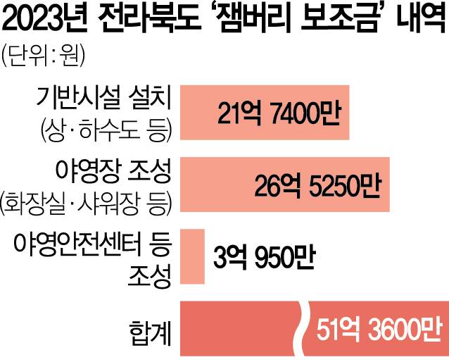 올해 전북도에 지급된 보조금 총액(약 51억 원)은 잼버리 사업을 위해 올해 여가부에 편성된 예산(95억 원)의 절반이 넘는다. 여가부는 보조금 지급 결정 당시 전북도에 송부한 통지서에서 교부 목적으로 ‘새만금 잼버리의 성공적 개최를 위한 사업 지원’을 꼽았다.