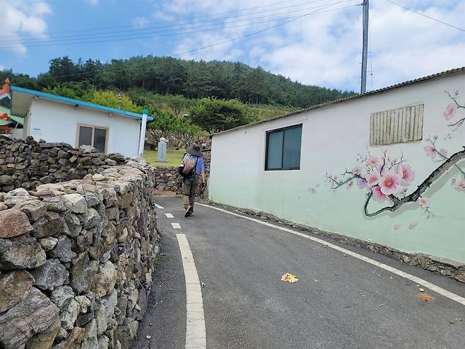 | ▲ 마을 골목길 담벼락에 그려놓은 홍매화 벽화, 조희룡이 남기고 간 흔적이다. 매화마을이 되었다. 홍매화를 심고 홍매화를 그려 넣었다. |