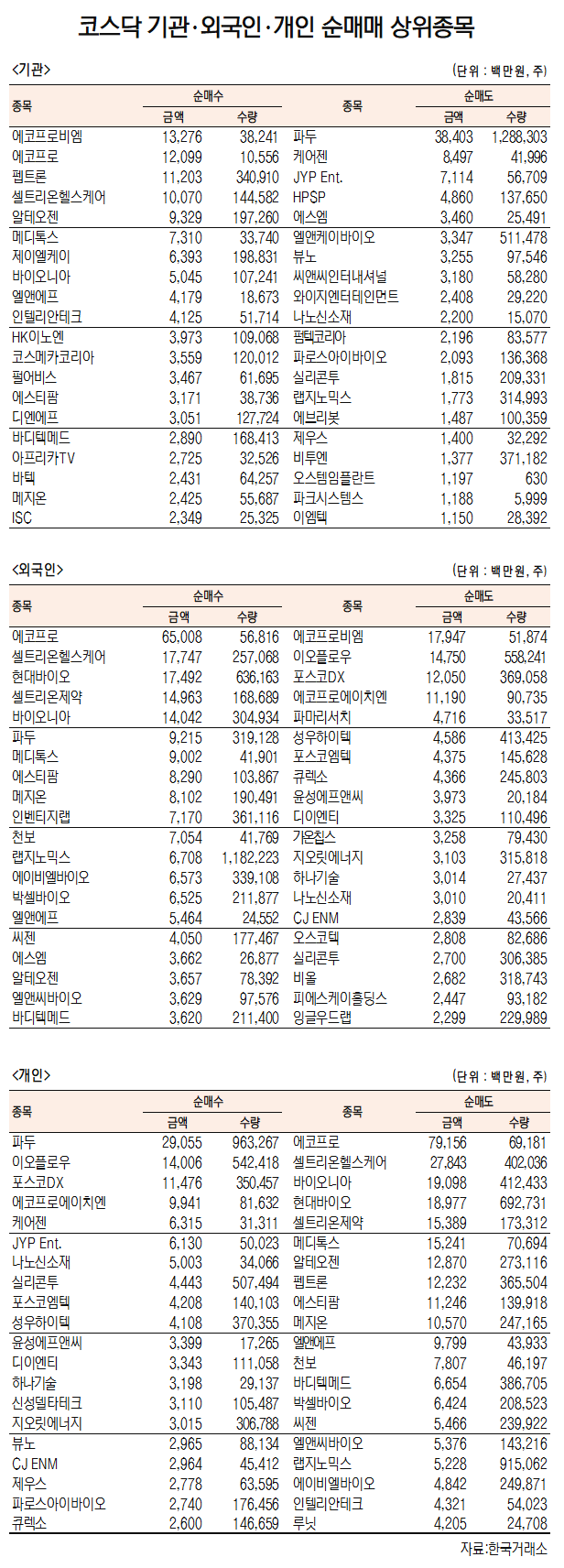 기관은 에코프로비엠(247540)(132억원)와 에코프로(086520)(121억원), 펩트론(087010)(111억원), 셀트리온헬스케어(091990)(101억원), 알테오젠(196170)(93억원), 메디톡스(086900)(73억원), 제이엘케이(322510)(64억원), 바이오니아(064550)(50억원), 엘앤에프(066970)(42억원), 인텔리안테크(189300)(41억원) 순매수했다. 순매도 상위 종목은 파두(440110)(384억원)와 케어젠(85억원), JYP Ent.(71억원), HPSP(49억원), 에스엠(35억원), 엘앤케이바이오(33억원), 뷰노(33억원), 씨앤씨인터내셔널(32억원) 등이다.
