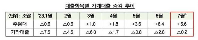 금융권의 대출금리가 여전히 높은 수준을 유지하는 상황에서, 금융권의 지난 7월 가계대출이 주택담보대출을 중심으로 5조원 넘게 늘어 올해 들어 월간 최대 증가폭을 기록했다. 전문가들은 이런 가계대출 증가세가 중·장기적으로 우리 경제를 옥죌 수 있다고 우려한다. 정부도 관계기관 회의를 열어 가계대출 증가세를 들여다보기로 했다.