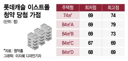 9일 한국부동산 청약홈에 따르면 이날 청약 당첨자 발표를 한 '롯데캐슬 이스트폴' 당첨자의 최고 가점은 79점이다. 전용 84㎡에서 79점짜리 통장이 나왔다.