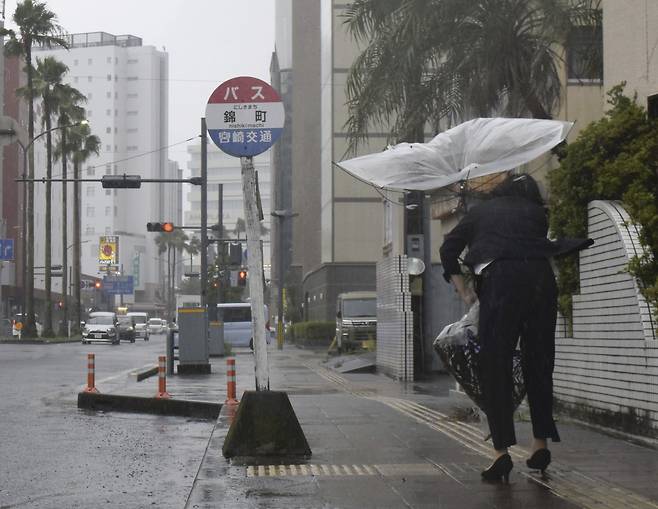 | ▲ 8일 일본 규슈 미야자키에서 한 시민이 태풍 '카눈' 영향으로 뒤집힌 우산을 붙잡고 걷고 있다. 일본 공영방송 NHK는 남부 오키나와 지방을 거쳐 한반도를 향해 북상 중인 카눈 영향으로 9일 오전 규슈 지방에 순간적으로 초속 40m가 넘는 강풍이 불고 큰비가 내렸다고 전했다. 이날 태풍의 영향으로 비바람이 치면서 항공, 선박, 철도 운행이 중단되고 133만명에게 피난 지시가 내려졌다. |