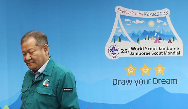 | ▲ 이상민 행정안전부 장관이 9일 오후 서울 중구 한국프레스센터에 마련된 임시 잼버리 프레스센터에서 태풍 비상대비 현황 브리핑을 마친 뒤 자리를 나서고 있다. |