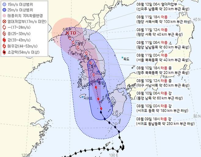 | ▲ 기상청이 예보한 태풍 예상 진로. 11일 00시에는 서울 북북동쪽 40km 근방에 있을 것으로 예상됩니다. |