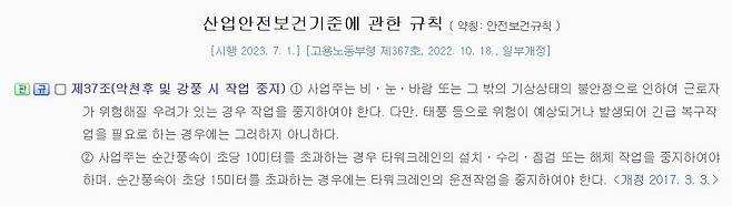 | ▲ 산업안전보건기준에 관한 규칙 제 37조. “사업주는 비·눈·바람 또는 그 밖의 기상상태의 불안정으로 인하여 근로자가 위험해질 우려가 있는 경우 작업을 중지하여야 한다.” |