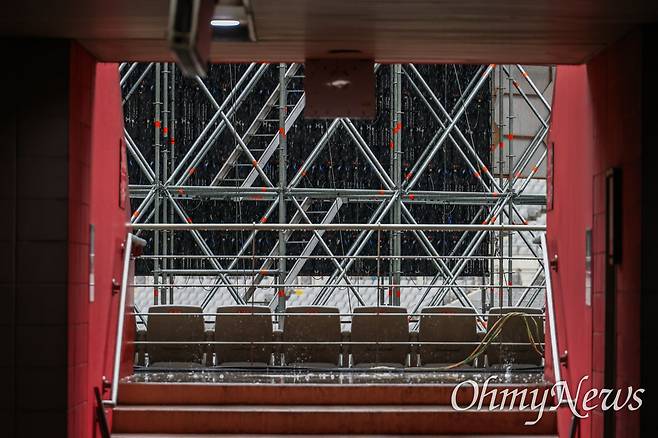| ▲ 경기장 객석 청소작업이 한창 진행중이다. |