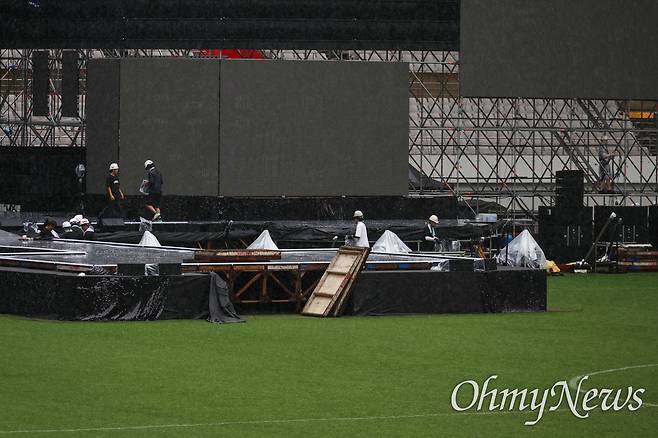 | ▲ 비를 맞으며 작업자들이 분주하게 무대 준비를 하고 있다. |