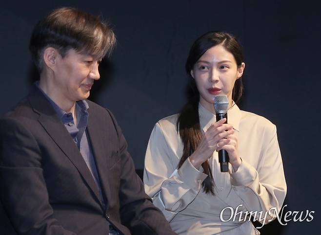 | ▲ 조국 전 법무부 장관의 딸 조민 씨가 17일 오후 서울 종로구 노무현시민센터에서 열린 <조국의 법고전 산책> 저자와의 대화에 깜짝 등장해 오연호 오마이뉴스 대표기자의 질문에 답변하고 있다. |