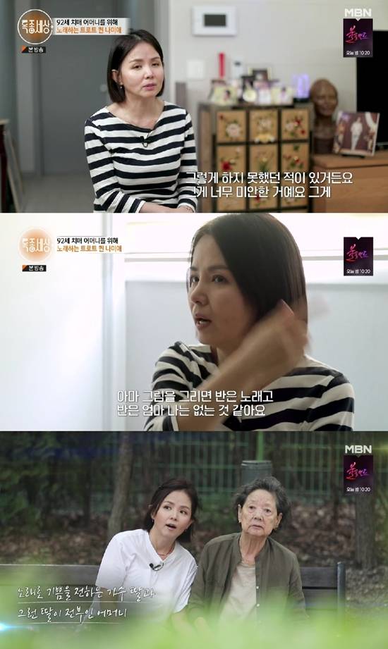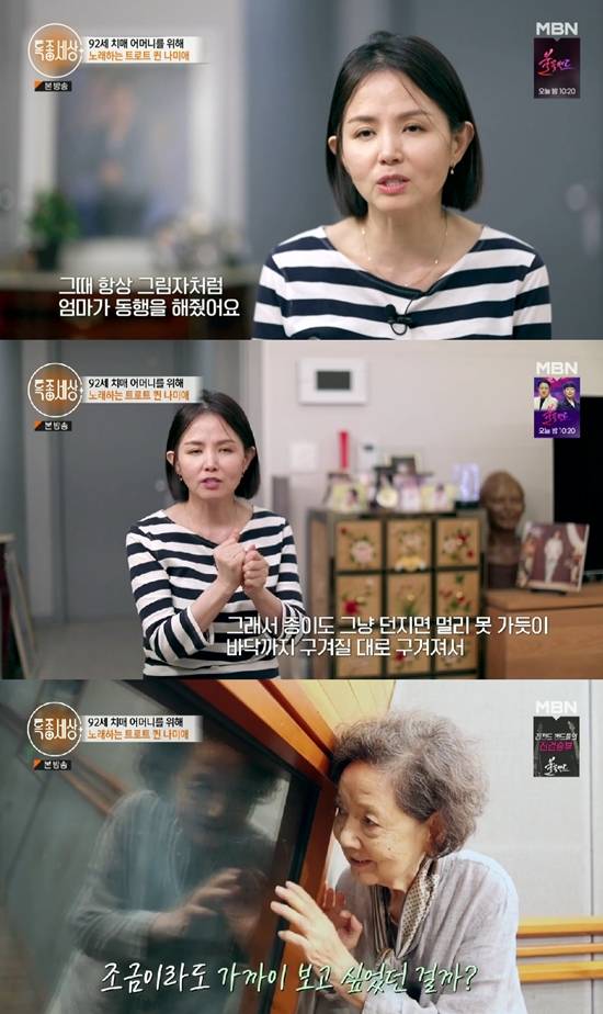 나미애는 "어찌 보면 제가 지금까지 결혼을 안 한 이유도 내가 아니면 엄마를 모실 수 없다는 생각을 어릴 때부터 했다. 결혼하게 되면 엄마에게 100% 신경을 써드리지 못할 것 같았다. 저의 뇌 속에는 항상 반은 노래고, 반은 엄마다. 저는 없다"라고 말했다.