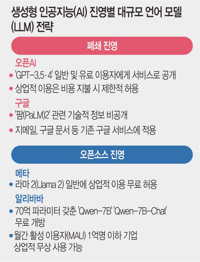 챗GPT를 개발한 오픈AI는 자사의 LLM인 GPT-3.5·4에 대한 기술적 정보를 외부에 대부분 공개하지 않았다. 이용자들이 LLM을 적용한 챗GPT를 자유롭게 사용하고 이를 활용한 서비스를 내놓는 범위까지만 허용했다. 구글 역시 팜(PaLM)2의 기술적 정보를 완전히 공개하지 않는다. 비용 지불 등의 협의가 있을 때만 제한적으로 기술적 정보를 알려준다.