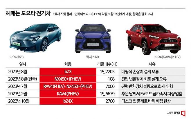 올해만 3번째 리콜(플러그인하이브리드차(PHEV) 포함) 이다. 모두 전기구동 및 전력 변환 시스템 결함이다. 지난달 준중형 스포츠유틸리티차(SUV) RAV4 프라임과 렉서스 NX450h+에서 전력변환장치 불량으로 계속 전류가 흐르는 현상이 발견됐다. 이로 인한 화재 발생 위험으로 7000대를 리콜했다. 지난 2월 미국에선 2021년형 RAV4 1만6679대가 추운 날씨에 EV모드(무급유 모드)로 급가속하면 차량이 멈추는 문제로 시정조치 판정을 받았다. 지난해 10월에는 첫 양산 전기차 bZ4X가 디스크 휠 문제로 급가속·제동을 연속적으로 하면 볼트가 풀려 바퀴가 빠지는 현상이 나타나 리콜을 했다.