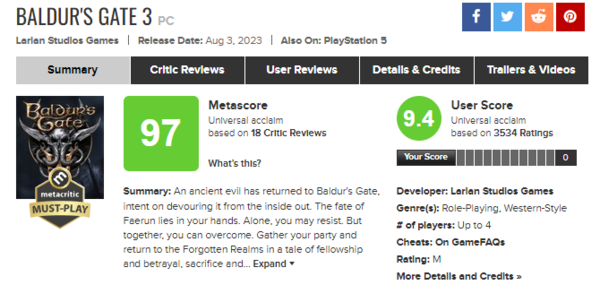 지난 7일 발더스 게이트3는 미디어 평점 95점, 유저 평점 9.2점으로 메타크리틱에 데뷔했다. 당시 6개의 미디어가 평점을 확정했다. 4일 정도 지난 11일 18개의 미디어가 평점을 확정지었고 2점 상승한 97점을 거뒀다. 유저 평점도 0.2점 오르면서 기대작의 면모를 물씬 과시했다.