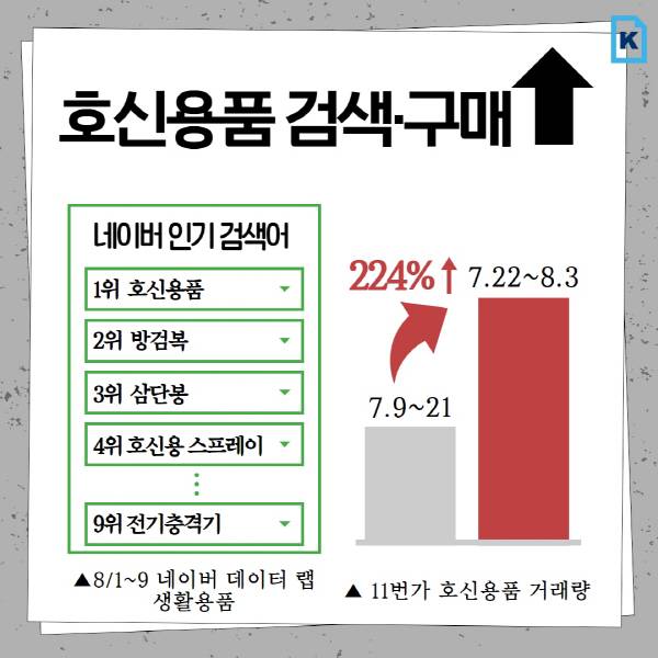 지난 1일부터 9일까지 평균을 낸 월간 네이버 인기 검색어 톱10에는 호신용품(1위)을 비롯해 방검복(2위), 삼단봉(3위), 호신용 스프레이(4위), 전기충격기(9위)가 이름을 올렸다.
