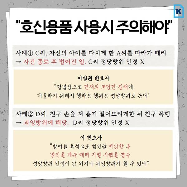 호신용품이라도 상황과 위력 정도에 따라 정당방위가 인정되지 않을 수 있어 주의가 요구된다.