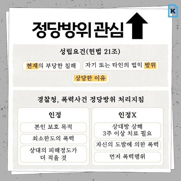 형법 제21조에 따라 정당방위가 성립되려면 ▲현재의 부당한 침해 ▲자신 또는 타인의 법적 이익을 지키기 위한 목적 ▲방위 행위에 대한 상당한 이유 등 3가지 요건을 모두 충족해야 한다. 야간 상황이거나 불안·공포를 느낀 상태, 흥분·당황했을 때 발생한 행위에 대해선 처벌하지 않는다.