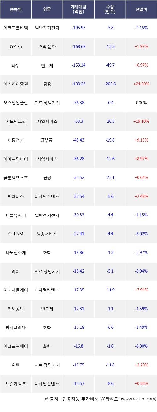 기관 투자자의 순매도 상위 20개 종목은 에코프로비엠, JYP Ent., 파두, 에스케이증권제10호스팩, 오스템임플란트, 지노믹트리, 제룡전기, 에이프릴바이오, 글로벌텍스프리, 펄어비스등이다.