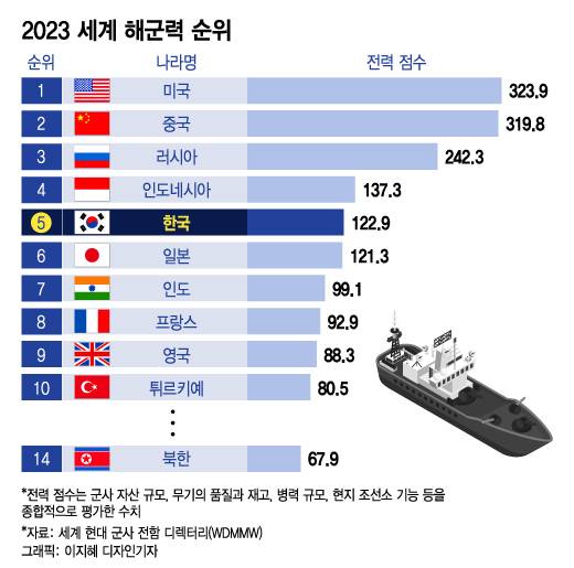 한국이 2023년 '세계 최강의 해군 순위' 5위로 선정됐다.