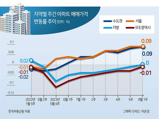 반면 지방 아파트값은 지난해 5월 첫 주(0.01%) 이후 한 주도 상승한 적이 없다. 하락세가 본격화된 같은 해 6월 둘째 주(-0.01%) 이후 60주 연속 아파트값이 떨어졌다가 이번주 처음으로 보합전환(0%)했다. 5대 광역시로 좁혀 봐도 아파트값은 지난해 1월 다섯째 주(-0.01%) 하락하기 시작해 이번주(-0.01%)까지 80주 연속 떨어졌다.