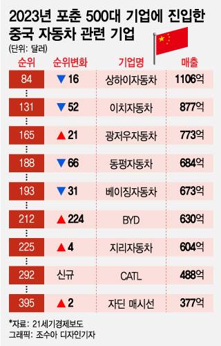 올해 글로벌 500대 기업에 진입한 중국 기업 수가 15년 만에 처음으로 감소했다는 사실도 눈에 띈다. 올해 글로벌 500대 기업에 이름을 올린 중국 기업 중 71%의 순위가 미끄러졌고 2021년 44위까지 상승했던 화웨이는 100위권 밖으로 밀려났다. 대신 BYD·CATL 등 중국 전기차 관련업체의 약진이 돋보였다.