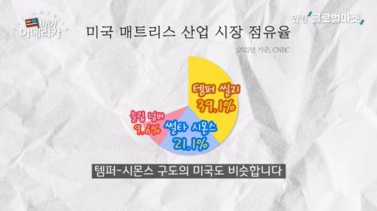 그런데 이렇게 30년째 이 순위가 바뀌지 않는 건, 본고장 미국도 마찬가지입니다. 바로 템퍼씰리-썰타시몬스 구도의 점유율에 큰 변화가 없기 때문입니다. 2010년대 이후 한국의 지누스, 미국에 캐스퍼 같은 온라인 매트리스 회사가 안착해서 싸고 배송 편리한 제품을 공급해 점유율을 파고 들지만 시장의 리더는 여전히 100년 이상의 역사에 현금 동원력이 큰 기존 매트리스 기업들입니다.