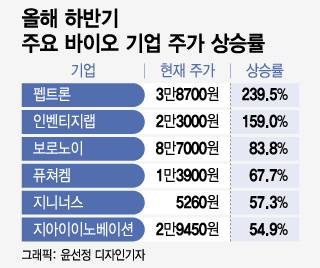 펩트론뿐 아니다. 인벤티지랩(159%), 보로노이(83.8%), 퓨쳐켐(67.7%), 지니너스(57.3%), 지아이이노베이션(54.8%) 등도 강세다. 이 같은 신약 개발 바이오의 동시다발적 급등은 이례적이다. 이 때문에 시장 일각에선 올해 하반기 기대할 만한 업종으로 바이오를 꼽기도 한다.