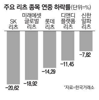 주가 급락에 배당수익률이 10%에 달하는 리츠들도 나왔지만, 투자심리 회복은 어려운 모습이다. 시가총액 1위 SK리츠 연중 주가는 20.62% 하락했다. 같은 기간 미래에셋글로벌리츠(-18.92%), 롯데리츠(-14.29%), 디앤디플랫폼리츠(-11.45%), 신한알파리츠(-7.82%) 등 우량 리츠 종목 주가가 대체로 내렸다.