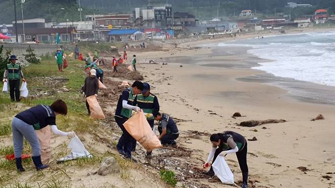 강원 고성군 공무원과 자원봉사자들이 13일 고성 현내면 대진리 초도 해수욕장에서 제6호 태풍 카눈으로 인해 해변에 밀려든 쓰레기를 치우고 있다.