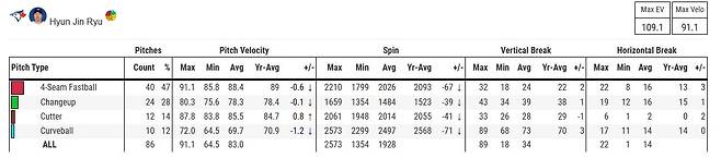 이날 류현진은 86구를 던진 가운데, 가장 큰 비중을 차지한 구종은 직구(40개)였다. 체인지업(24개)·컷 패스트볼(12개)·커브(10개)가 그 뒤를 이었고, 직구 최고 구속은 시속 91.1마일(약 147km)로 측정됐다.