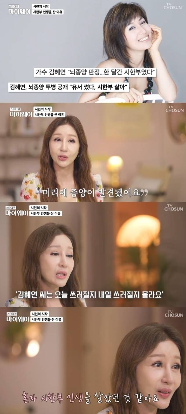 이날 김혜연은 뇌 종양 판정을 받았던 당시를 떠올리며 “건강 검진을 다 받고 결과를 보는데, 머리에 종양이 발견됐다. 의사께서 ‘김혜연 씨는 오늘 쓰러질지 내일 쓰러질지 몰라요’라고 하시더라. 그 소리를 듣는 순간 아무 생각이 들지 않았다"고 털어놨다.
